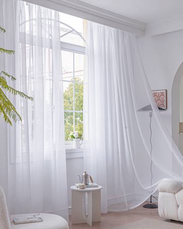 Voile sheer overlay obscures the sharp edges of the cutout and subdue the exquisite colors of the fabric, showering the room with rainbow-like glamour
