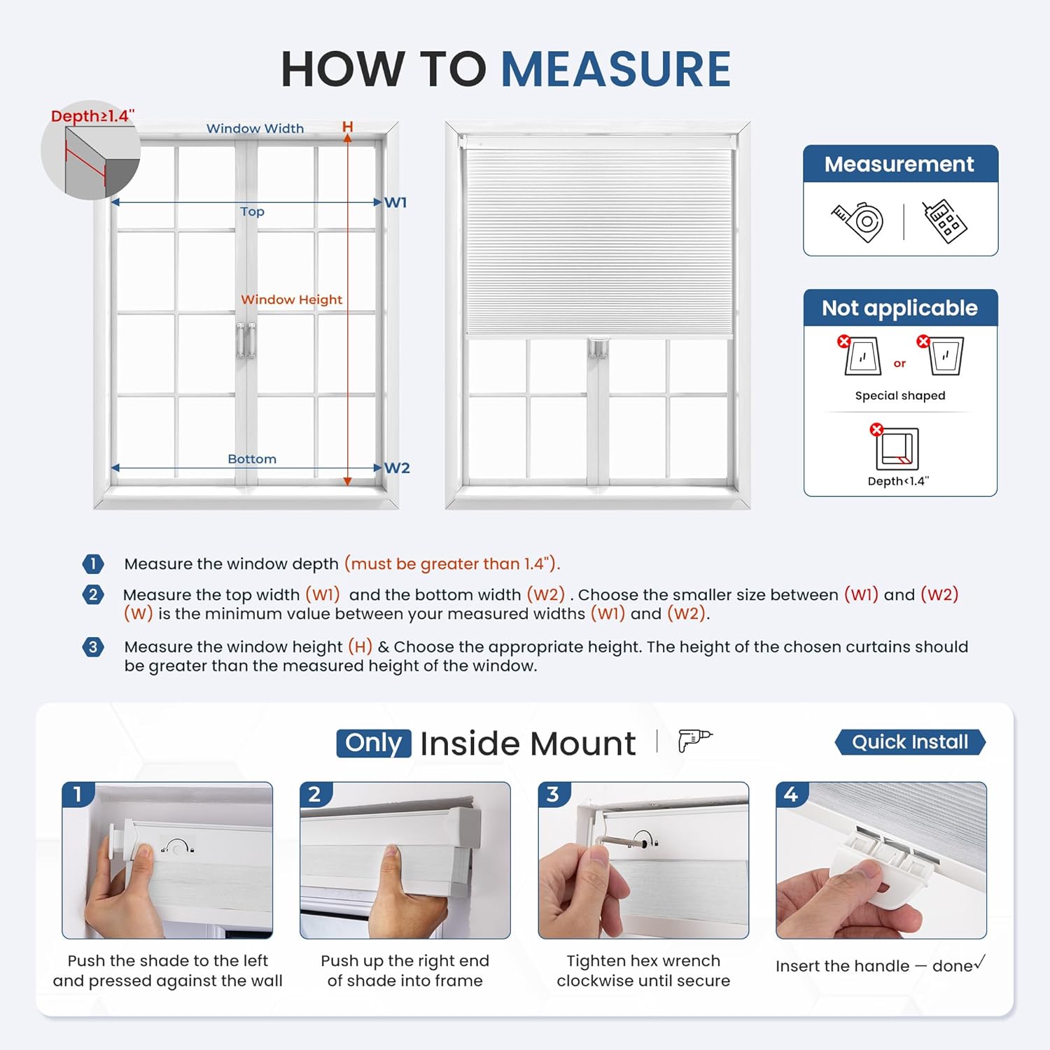 Grandekor No Tools No Drill Cordless Cellular Shades,46" W x 48" H,Blackout Honeycomb Blinds for Indoor Windows,UV Protection Privacy No Drill Blinds for Home,Door,White